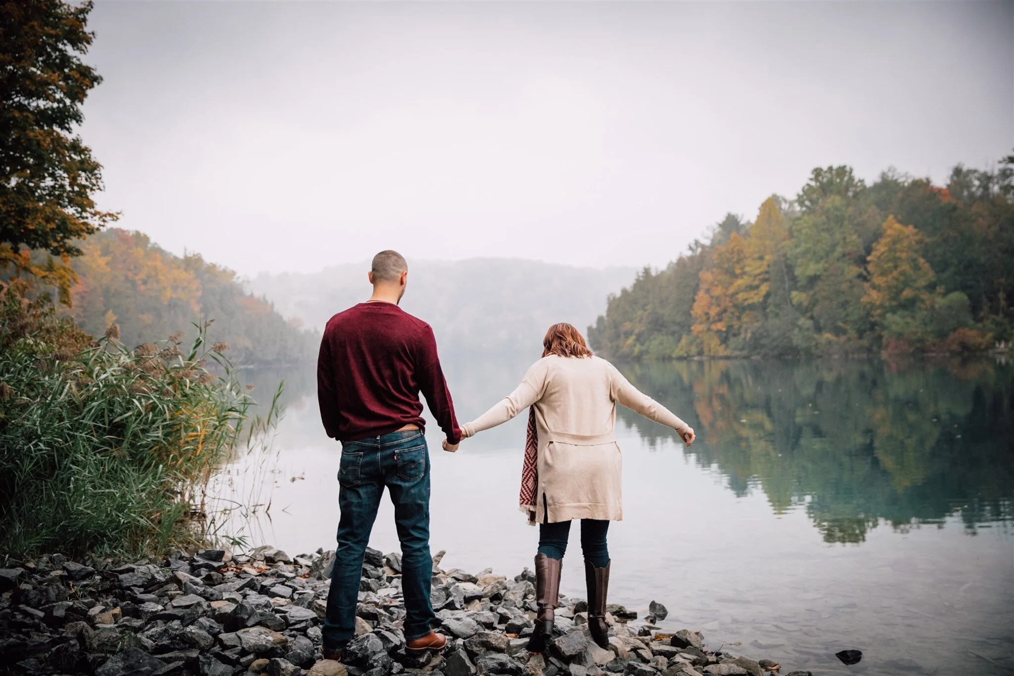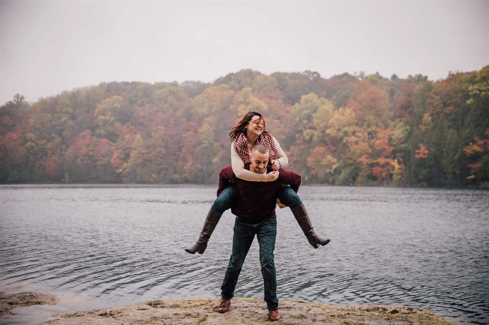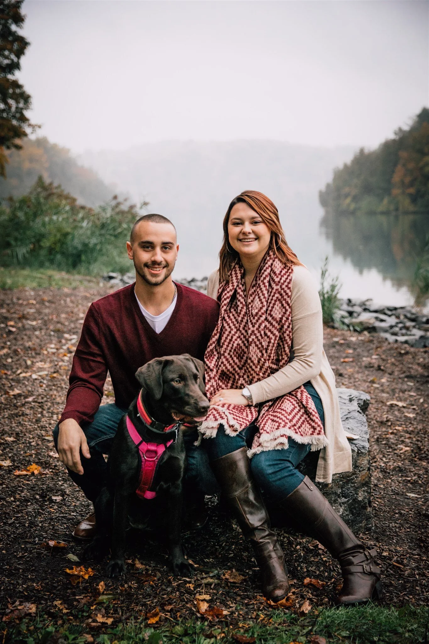 Becca and Alex are such a joy to be around! They agreed to still have their engagement session at Green Lakes State Park in the rain, and it was the dreamiest setting!! I’m all for rainy sessions because look at how atmospheric the images are! They even brought their pup too! Pro tip: bring a family member or friend so they can hold your dog when you want pictures of just the two of you.