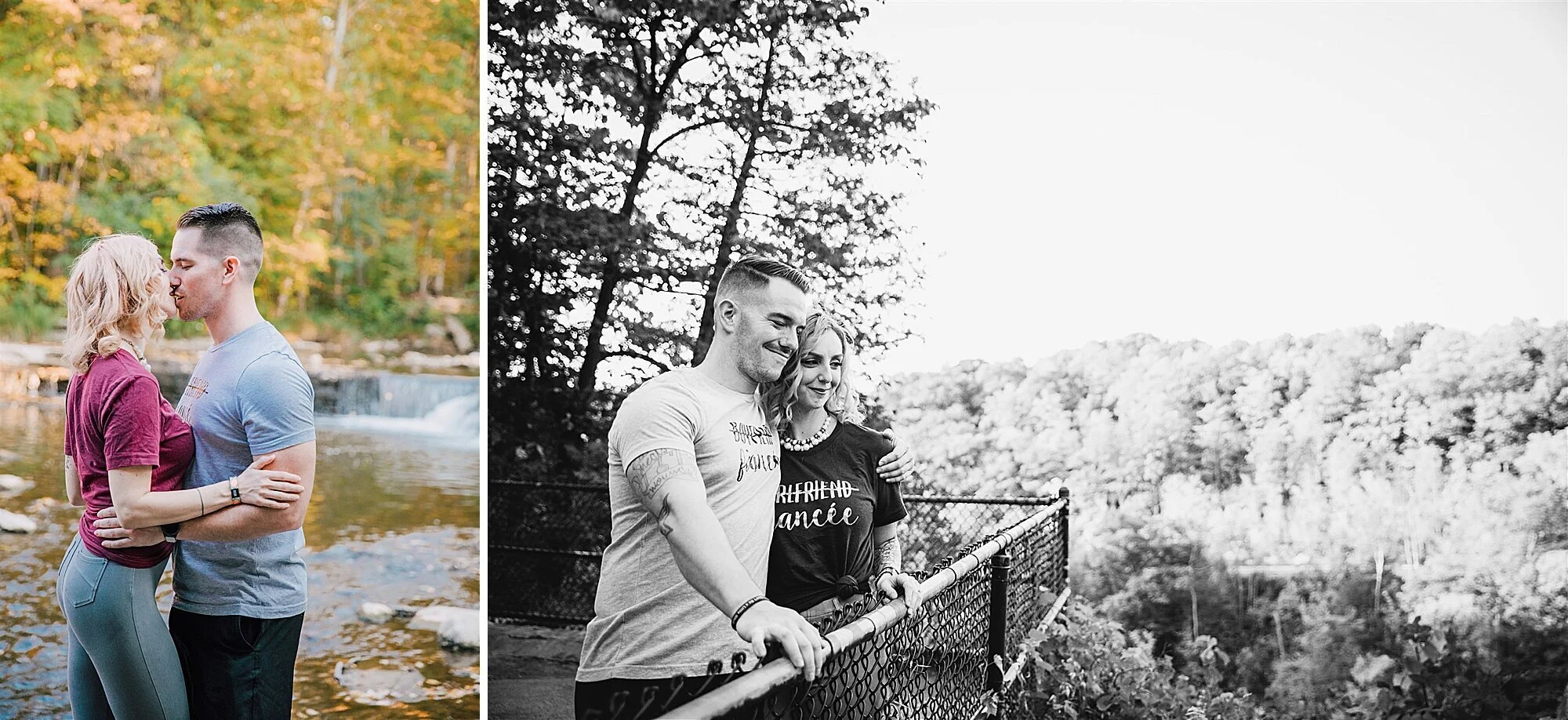 Before the session, they did a tasting at Glazed and Confused (one of my favorite vendors for wedding desserts!). They showed up for the shoot in the sweetest matching t-shirts, which showed off their newly-engaged status. We wandered around the upper portion of the park and took advantage of the gorgeous fall colors and the Chittenango Falls overlook.