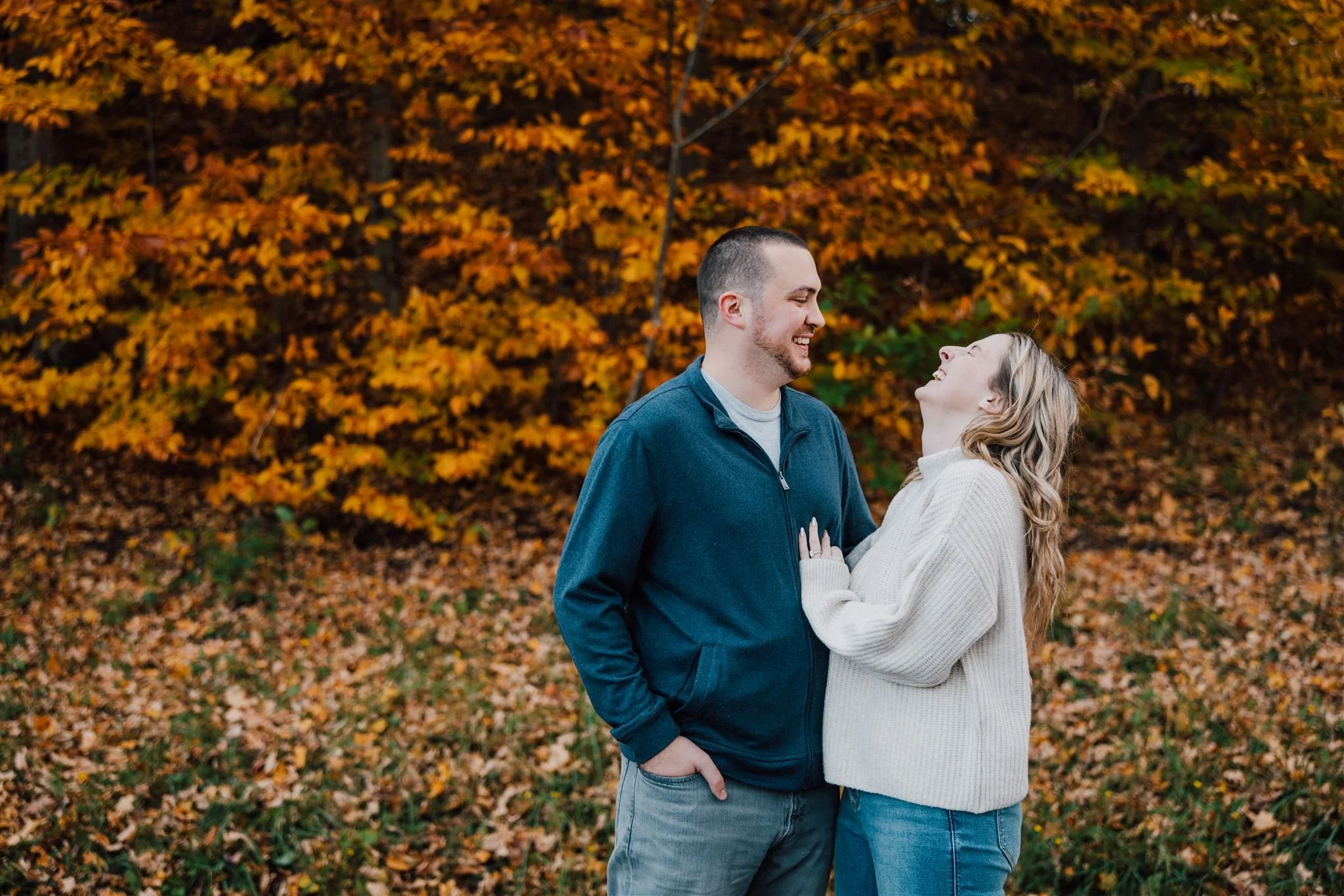 Some of my favorite photos from the day were the ones filled with genuine laughter and sweet glances—those unposed moments that truly reflect a couple’s connection. Before we wrapped up, we even found the perfect leaf to use for a playful ring shot. It was the perfect ending to a perfect fall session.