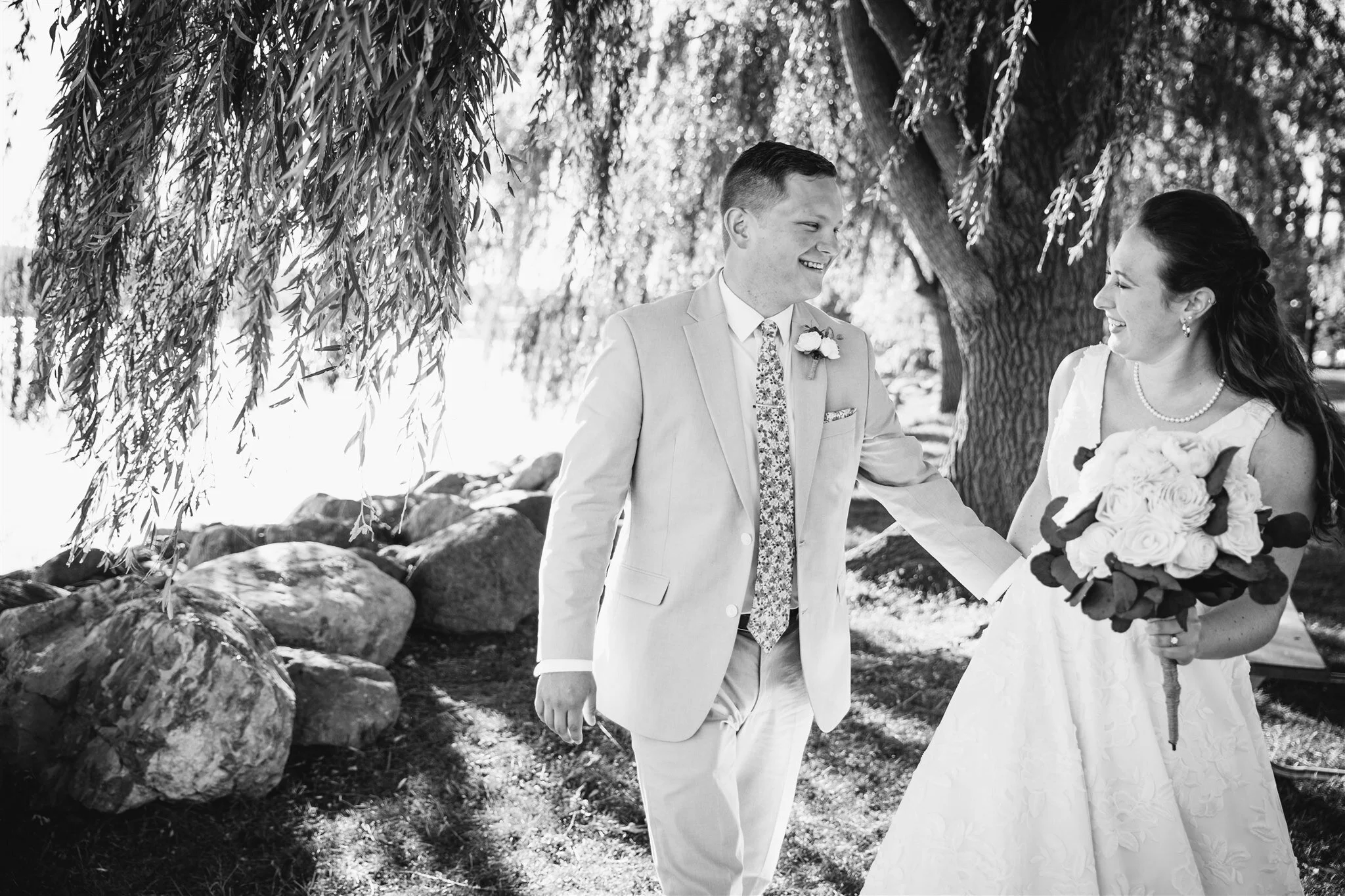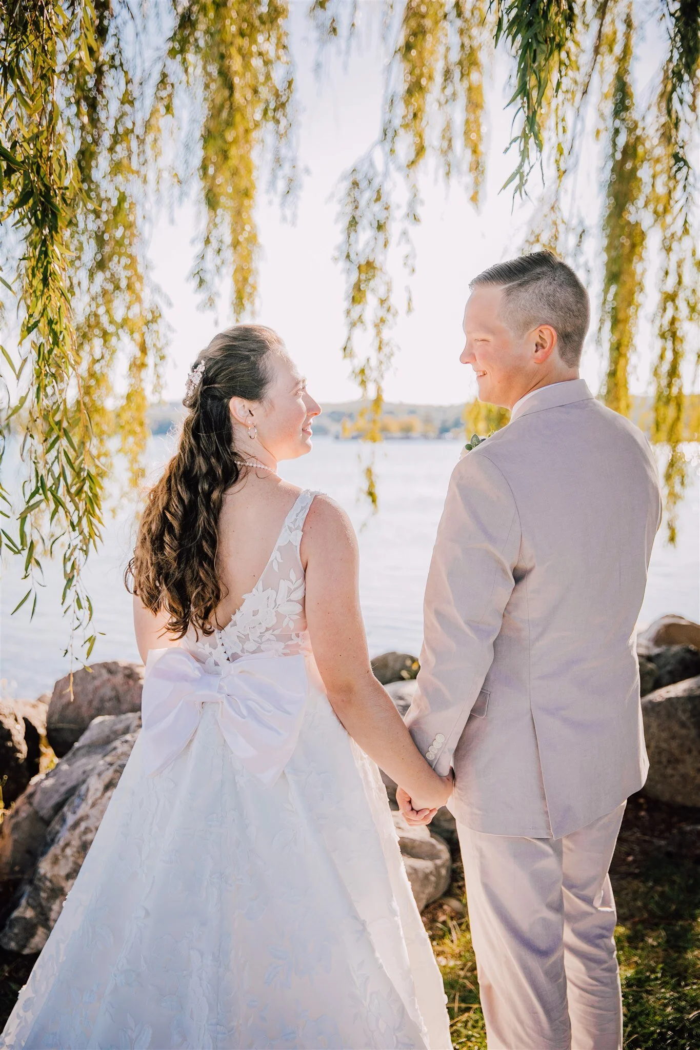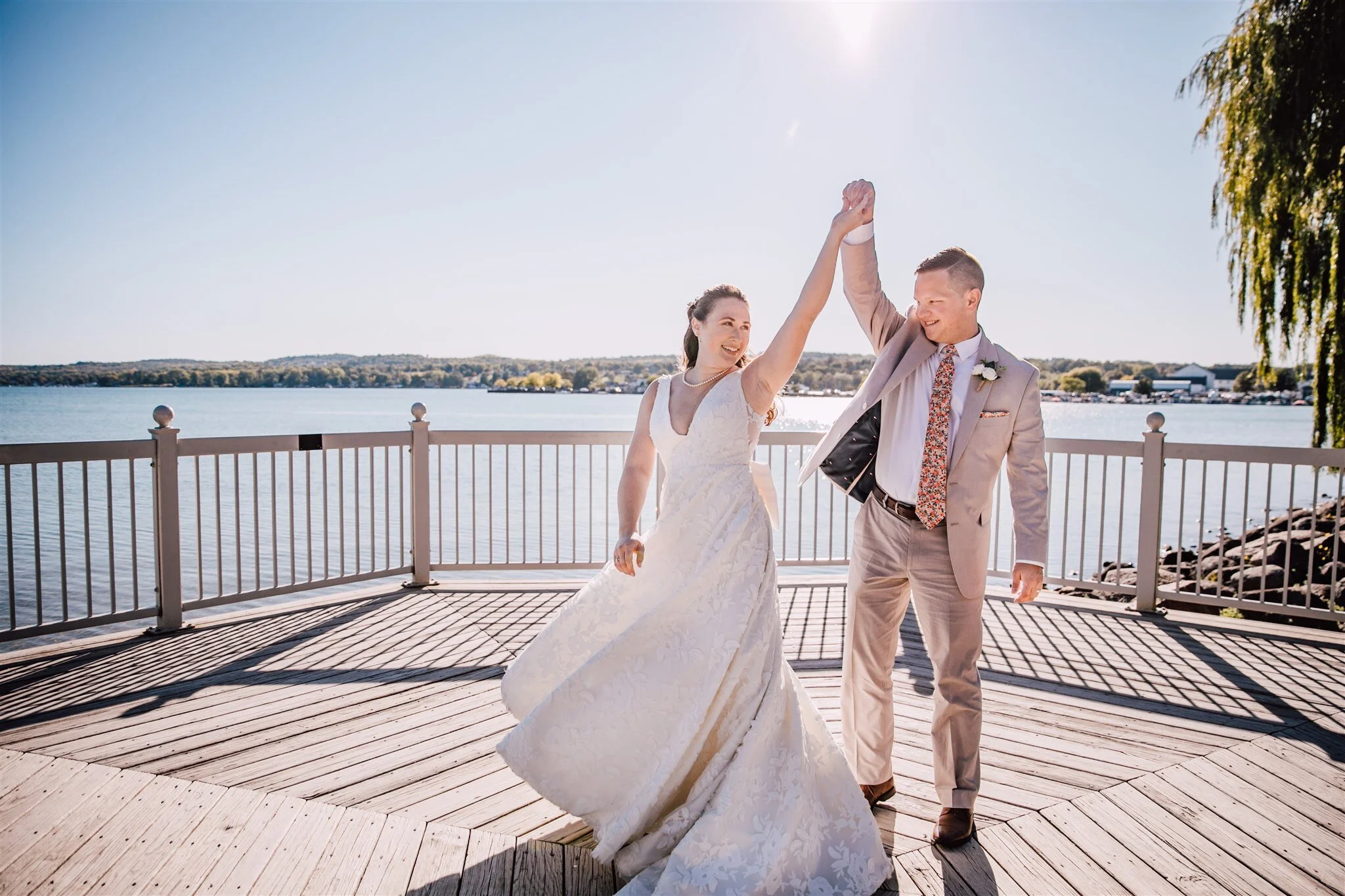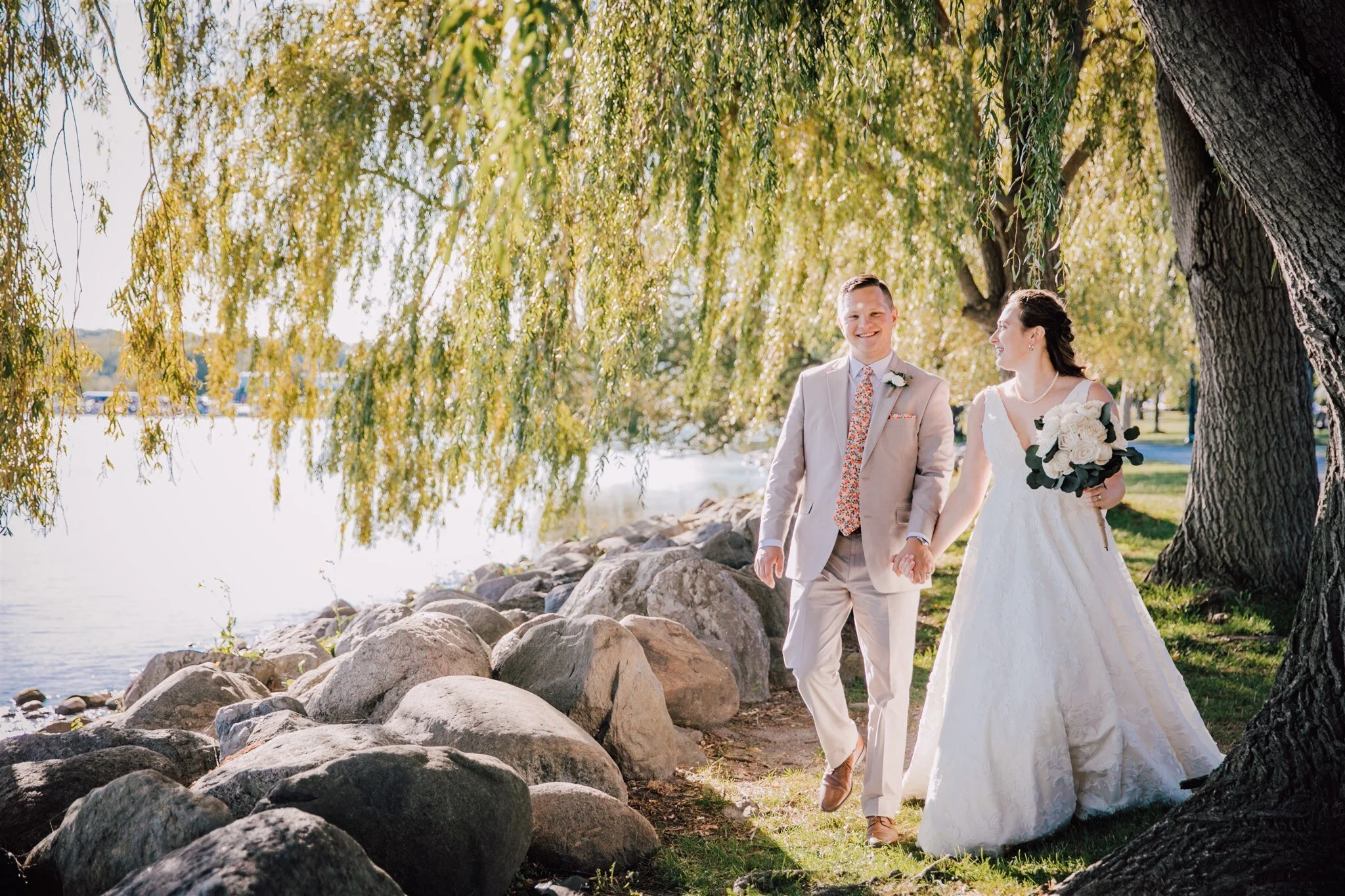 We snapped a few photos with the Bride and Groom before heading over to Canandaigua Lake for portraits. Celebrating your wedding with your dog by your side is a dream for a lot of couples, so naturally, we included their pup Guinness in some of the wedding photos by the lake. The glistening willow tree branches at Canandaigua Lake made for a gorgeous backdrop for Emily and Ben’s portraits.