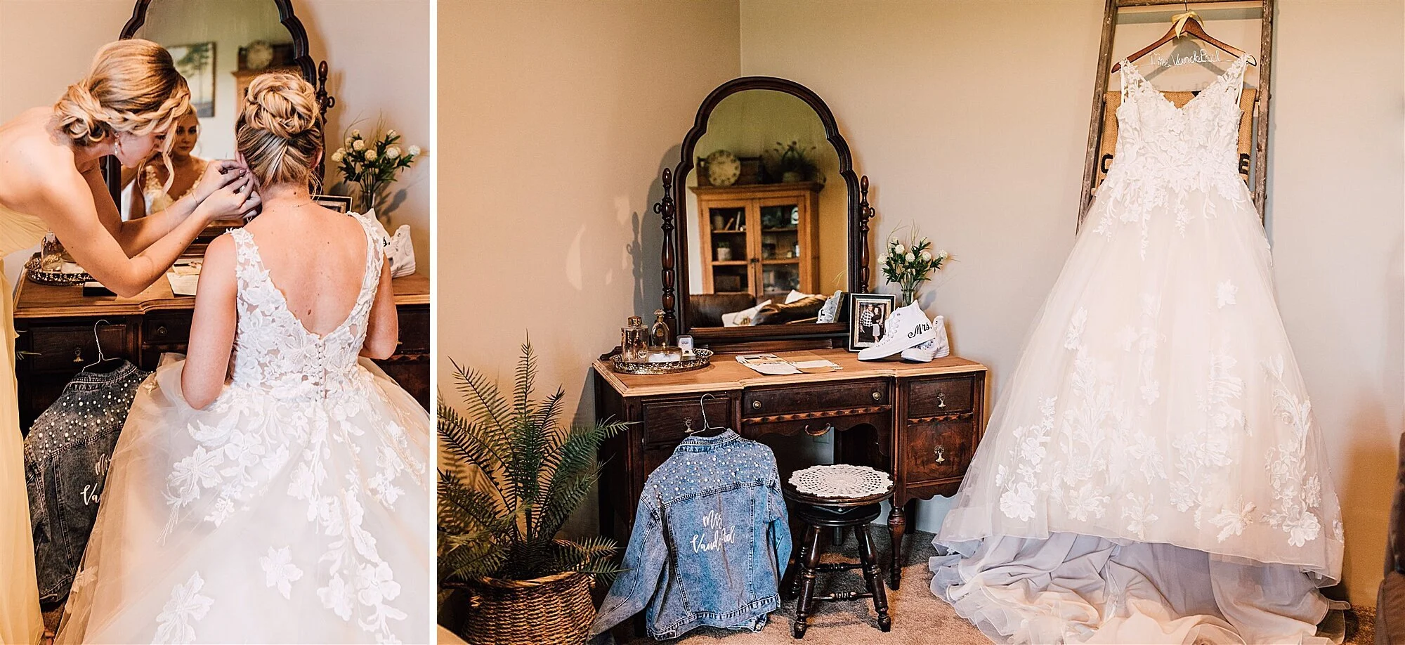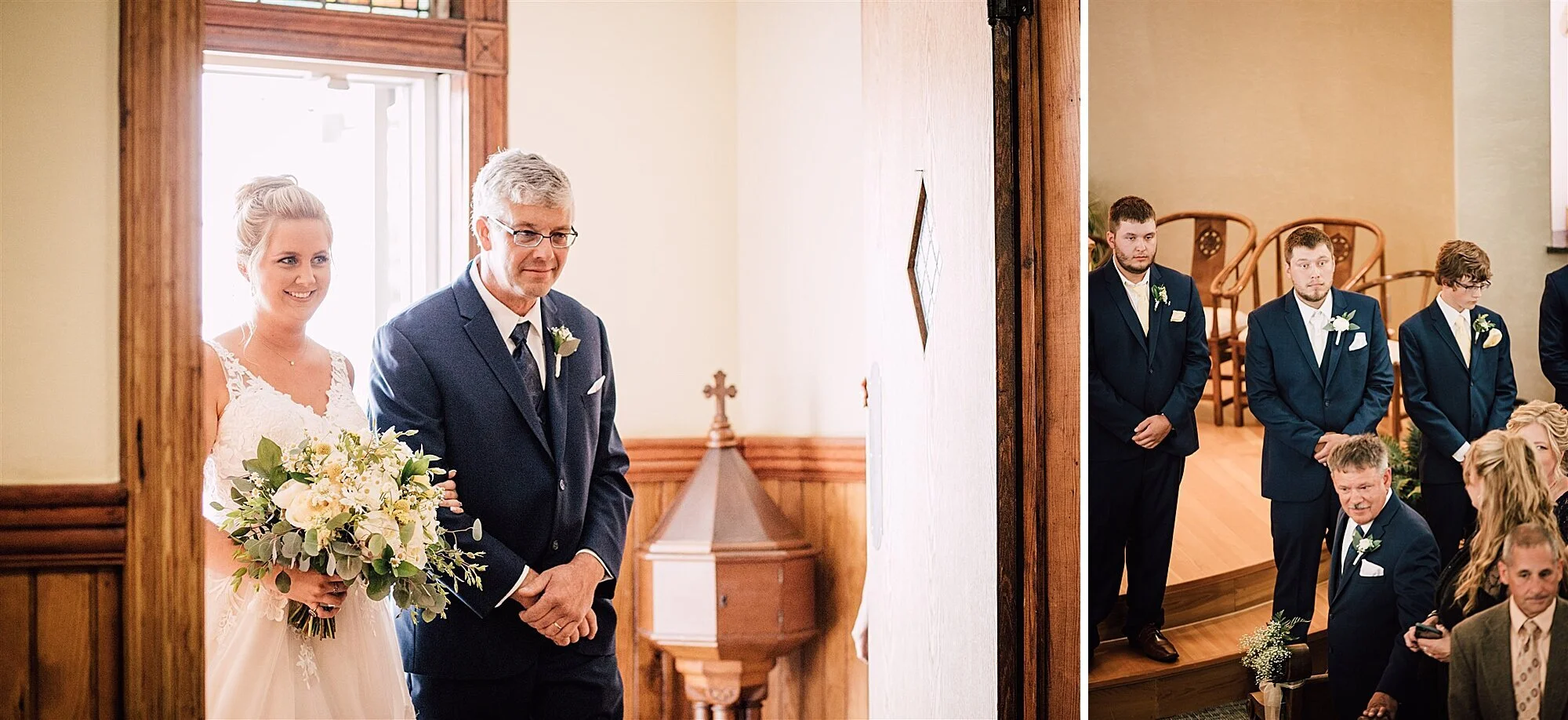 The day kicked off with Heather and her bridesmaids getting ready at her parents’ house. Heather’s mom had painstakingly refinished a beautiful vintage vanity so her daughter could get ready at it. I used it as a backdrop for her jewelry and other details before she slipped into her wedding dress. Once all ready, Heather and her Dad shared a touching first look with her grandparents’ farm in the background, before heading to the church.