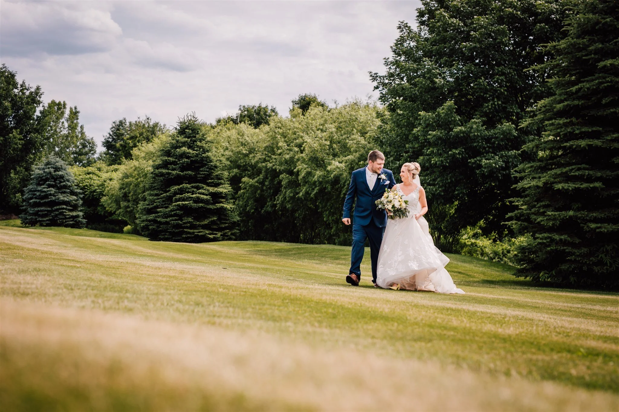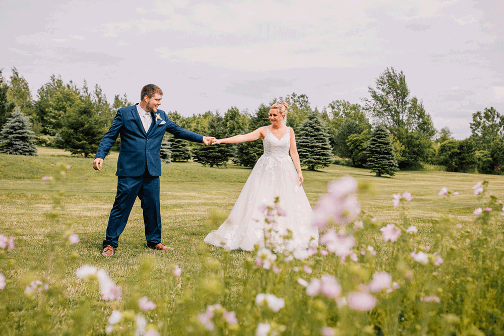 The reception took place at The View Event Center at Sunset Pines. It’s a brand new space (the doors opened in 2020), so it was my first time inside, and it was absolutely stunning with floor-to-ceiling views of the golf course. It gave off the perfect rustic country wedding vibes. They graciously closed down the greens so we could go exploring and snap some golf course wedding photos of the Bride and Groom. We stumbled across a patch of wildflowers that immediately took me back to their engagement session in a field of grain. I created a GIF to go along with the one from their 2019 engagement session.