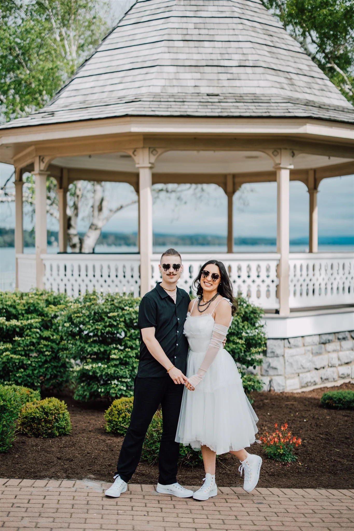 Our next stop was the charming village of Skaneateles. At Clift Park, we found multiple picturesque backdrops, including a flowering bush, stonework, trees, a gazebo, and the stunning Skaneateles Lake. Shelby and Devin changed into custom Converse sneakers, each pair uniquely personalized with phrases like “Till death do us part” and “My Always” and “Forever” on the soles. Shelby's creative idea of having Devin cut the bottom of her dress for a shorter, more casual look was a sweet moment to document.